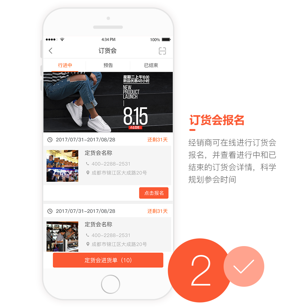 厂商开设内部订货会专场,经销商可远程报名参加,实现线下体验新品,线上下单订购的模式,快节奏的打造一场新品订货会。