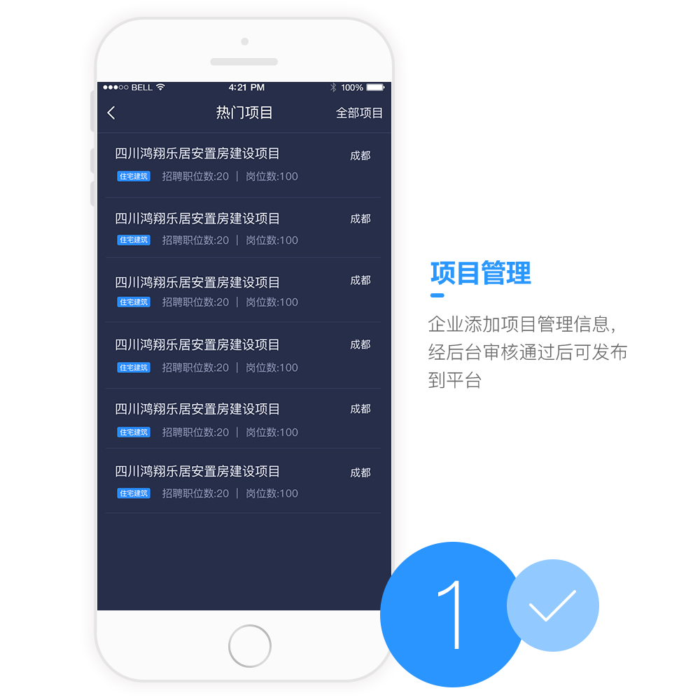 企业添加项目管理信息,经后台审核通过后可发布到平台。